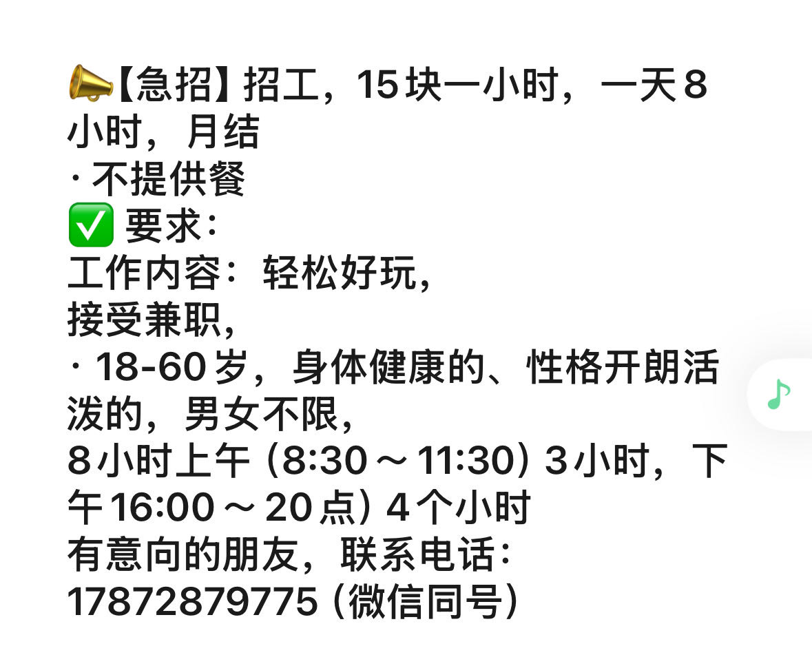 📣【急招】招工,15块一小时,**8小时,月结